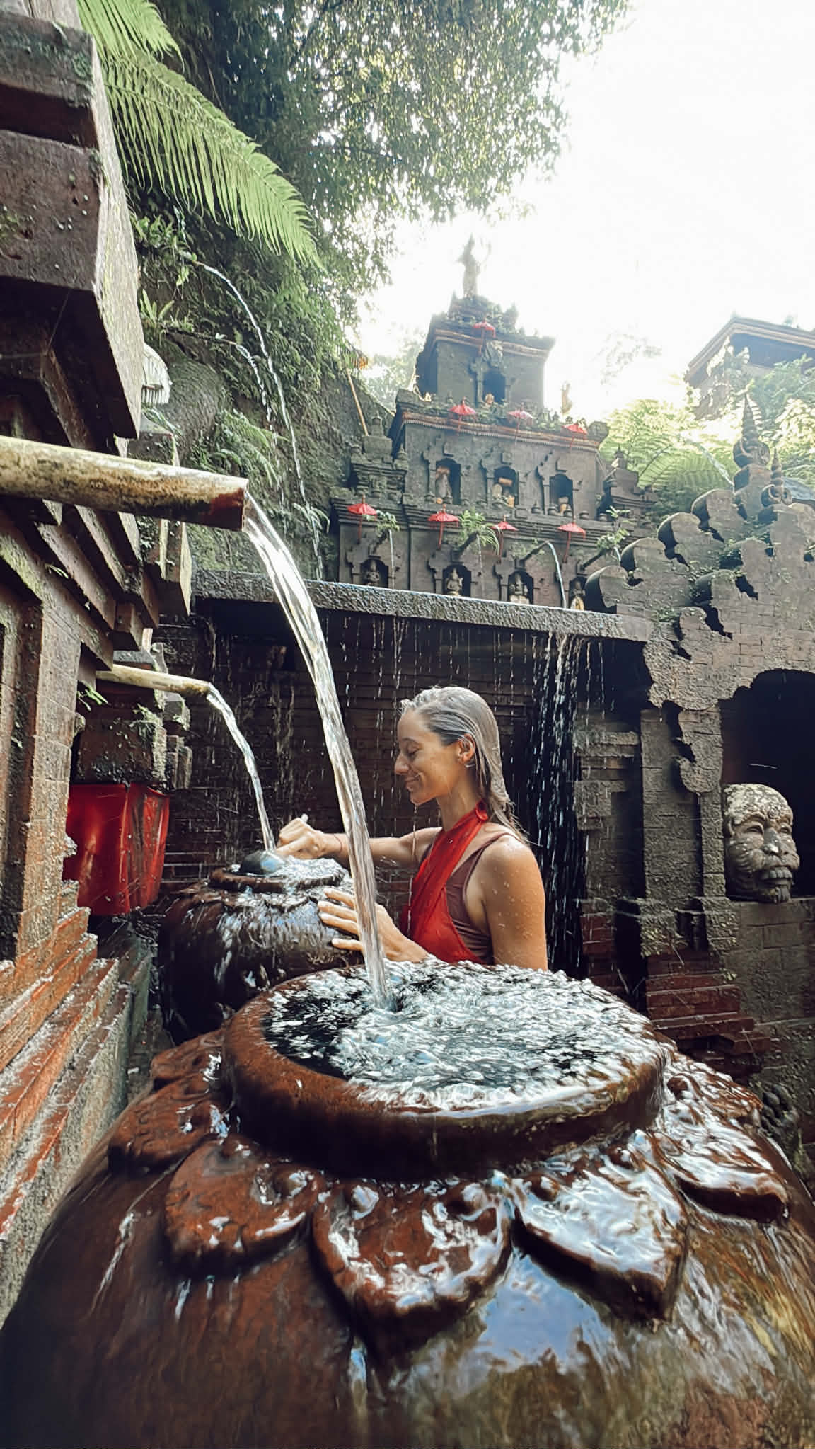 Pura Tirta Empul (entrée 3 €) est l’un des temples les plus sacrés de Bali, dédié à Vishnu, Shiva, Brahma et Indra. Selon la légende, ses sources furent créées par le dieu Indra pour honorer Vishnu, divinité de l’eau MAIS TROP TOURISTIQUE. Le rituel de purification, appelé melukat, se déroule dans les piscines sacrées. Avant d’y entrer, on médite, prie et dépose une offrande pour demander l’autorisation. À chaque fontaine, on formule une intention ou un vœu, puis on se lave le visage trois fois et on plonge trois fois la tête et le corps.
